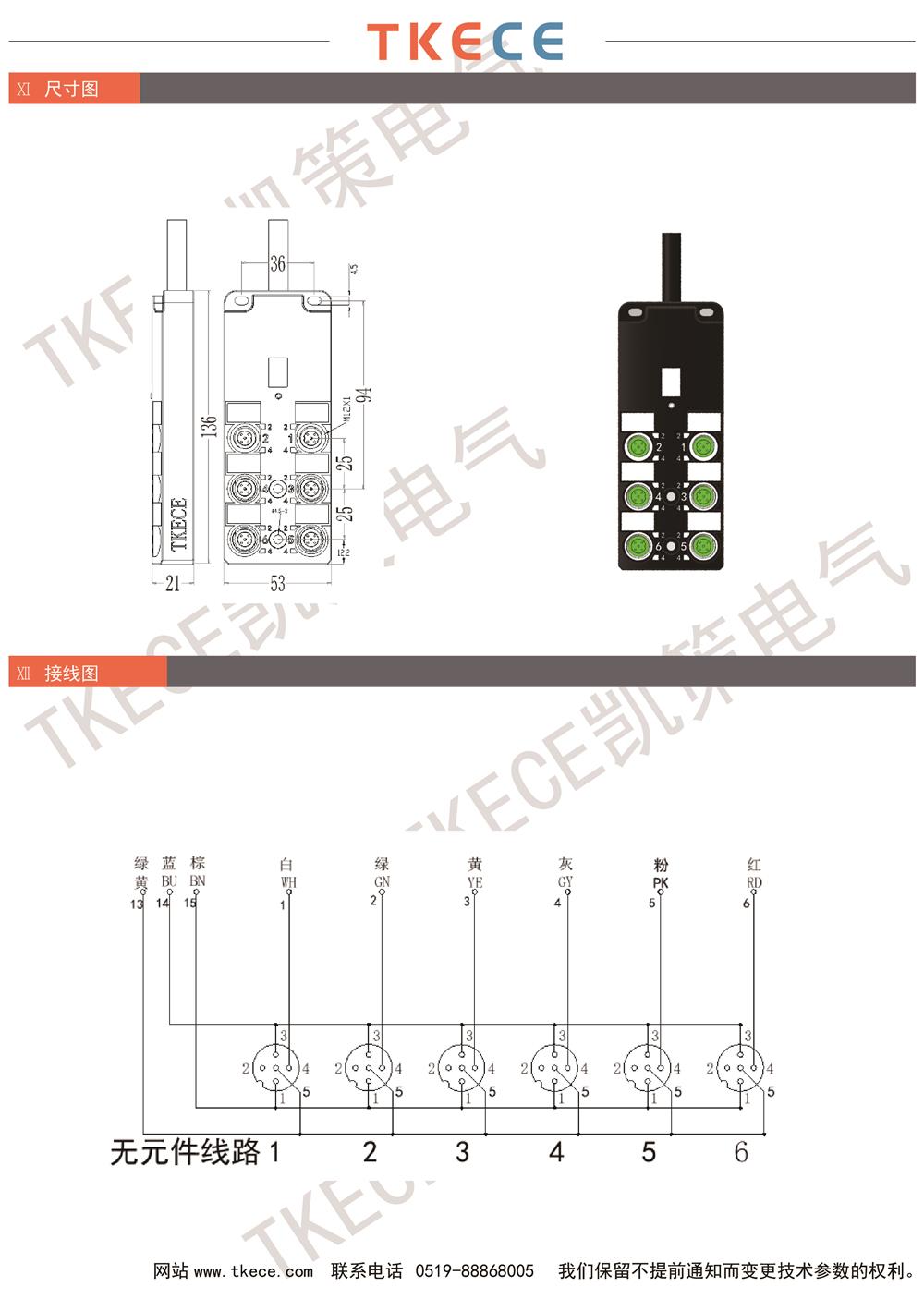产品名称:M12 KL系列6位 订货型号:KL6K-M12K5-WxxxPUR 订货代码: