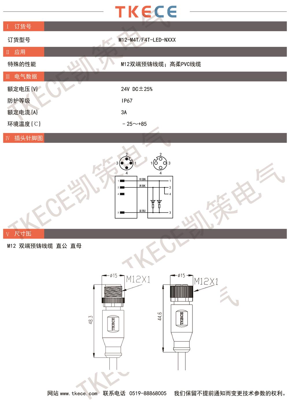 产品名称:M12 双端线缆 直头公头转直头母头 LED